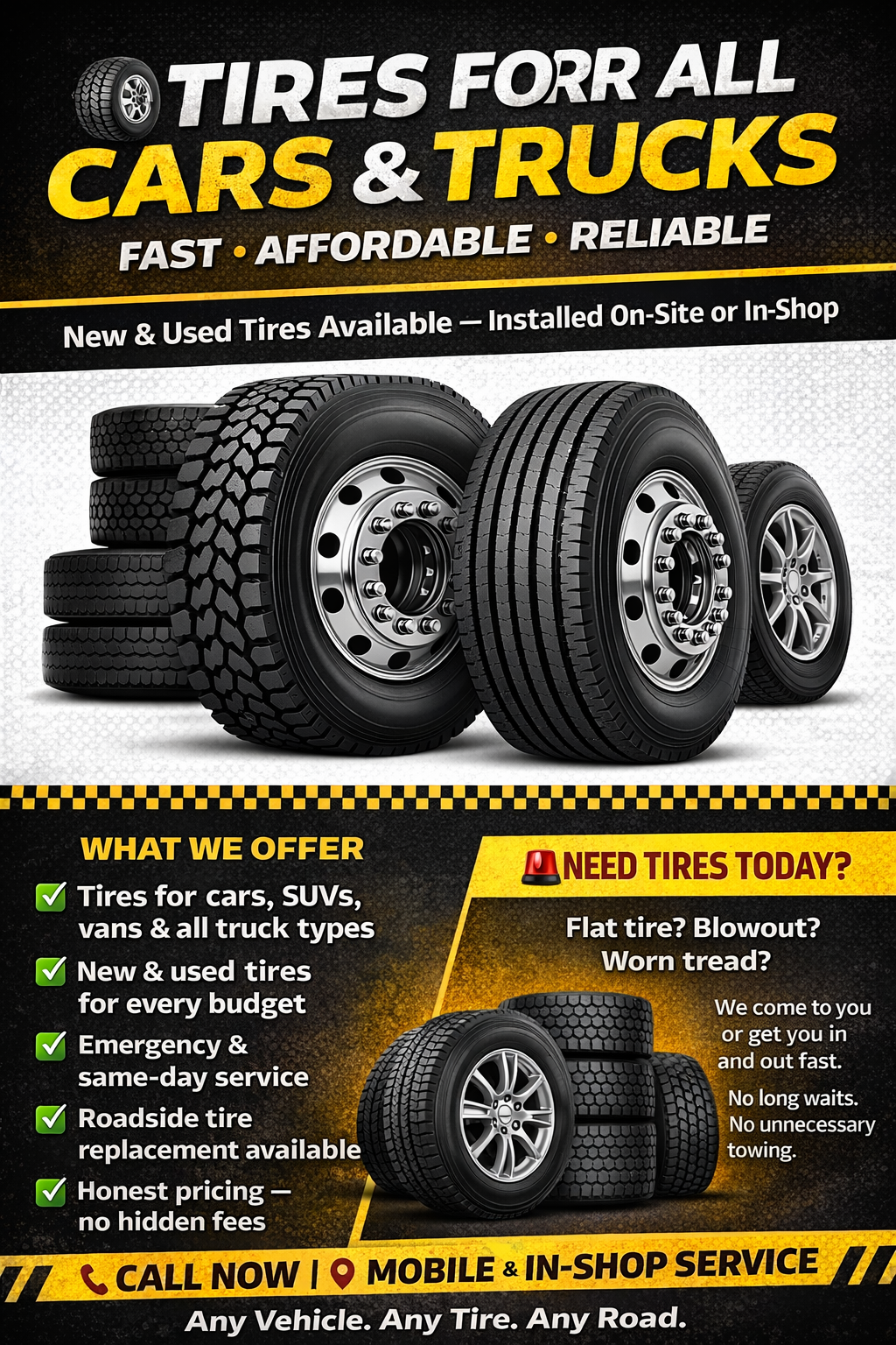 We provide fast, dependable roadside assistance and quality tire sales for drivers who can’t afford delays. From emergency tire changes and lockouts to on-site tire replacement, we bring professional service directly to you, whether you’re stranded on the road, at home, or at work.